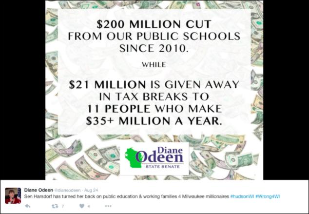 “200 million cut from our public schools since 2010, while $21 million is given away in tax breaks to 11 people who make $35+ million a year. Sen. Harsdorf has turned her back on public education and working families 4 Milwaukee millionaires.”