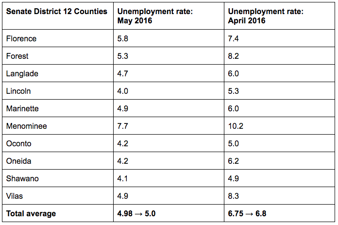 The average unemployment rate in the counties that represent District 12 reached 5.0 percent in May 2016. This is not only higher than the state average, but the national average as well. The county with the lowest rate in District 12 was Lincoln, with a rate of 4.0 percent, and the county with the highest rate was Menominee, at 7.7 percent. Menominee’s rate is the highest in the state of Wisconsin.