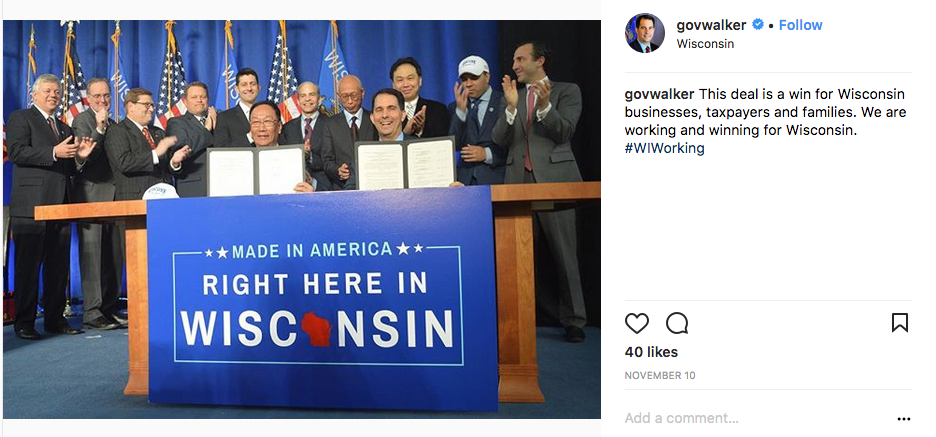 In light of Walker’s 2018 re-election campaign as well as a national concern over the health of American manufacturing, the news was significant. State officials later negotiated an agreement calling for the Taiwanese manufacturer to receive up to $3 billion in state tax subsidies — an incentive that some elected officials, primarily Democrats, questioned as the tax breaks were written into law.