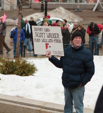 A protester signals his displeasure with Gov. Scott Walker’s plan, later adopted by the Republican-run Legislature, to strip collective bargaining rights from most public employees in Wisconsin, including teachers, during this Feb. 17, 2011 demonstration at the state Capitol in Madison. Sen. Kathleen Vinehout, who is running for governor in the Democratic primary, claims the change has harmed teachers and education in the state.