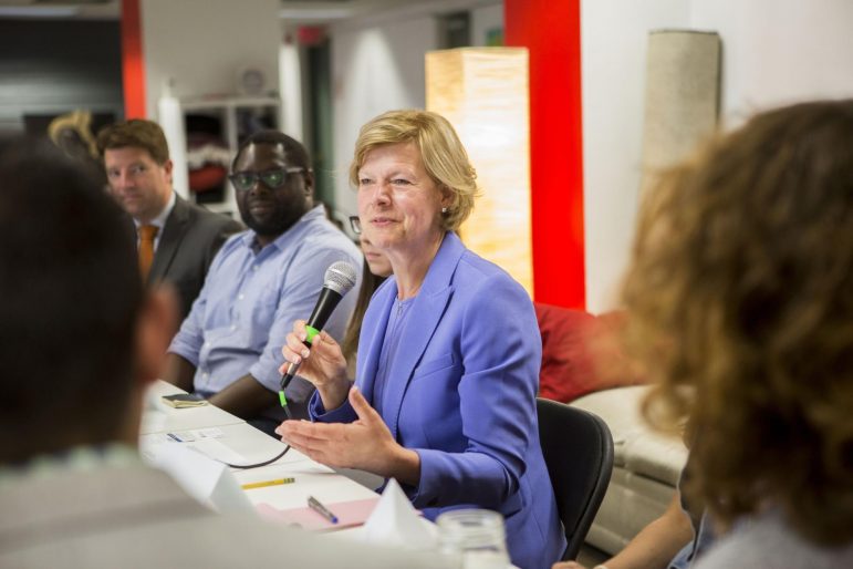 The Observatory rates U.S. Sen. Tammy Baldwin's claim about the Farm Bill giving farmers “the tools they need to meet these challenging times” as Verified. She is seen here at a roundtable session in Madison, Wis. on Aug 18, 2016.