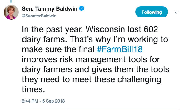 “In the past year, Wisconsin lost 602 dairy farms,” Baldwin tweeted. “That’s why I’m working to make sure the final #FarmBill18 improves risk management tools for dairy farmers and gives them the tools they need to meet these challenging times.”