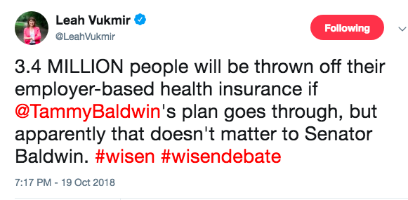 During an Oct. 19 debate and in a tweet, Republican U.S. Senate candidate Leah Vukmir said 3.4 million people will be “thrown off their employer-based health insurance” under Medicare for All, a proposal co-sponsored by Democratic U.S. Sen. Tammy Baldwin. Vukmir lost to Baldwin in the Nov. 6 election.