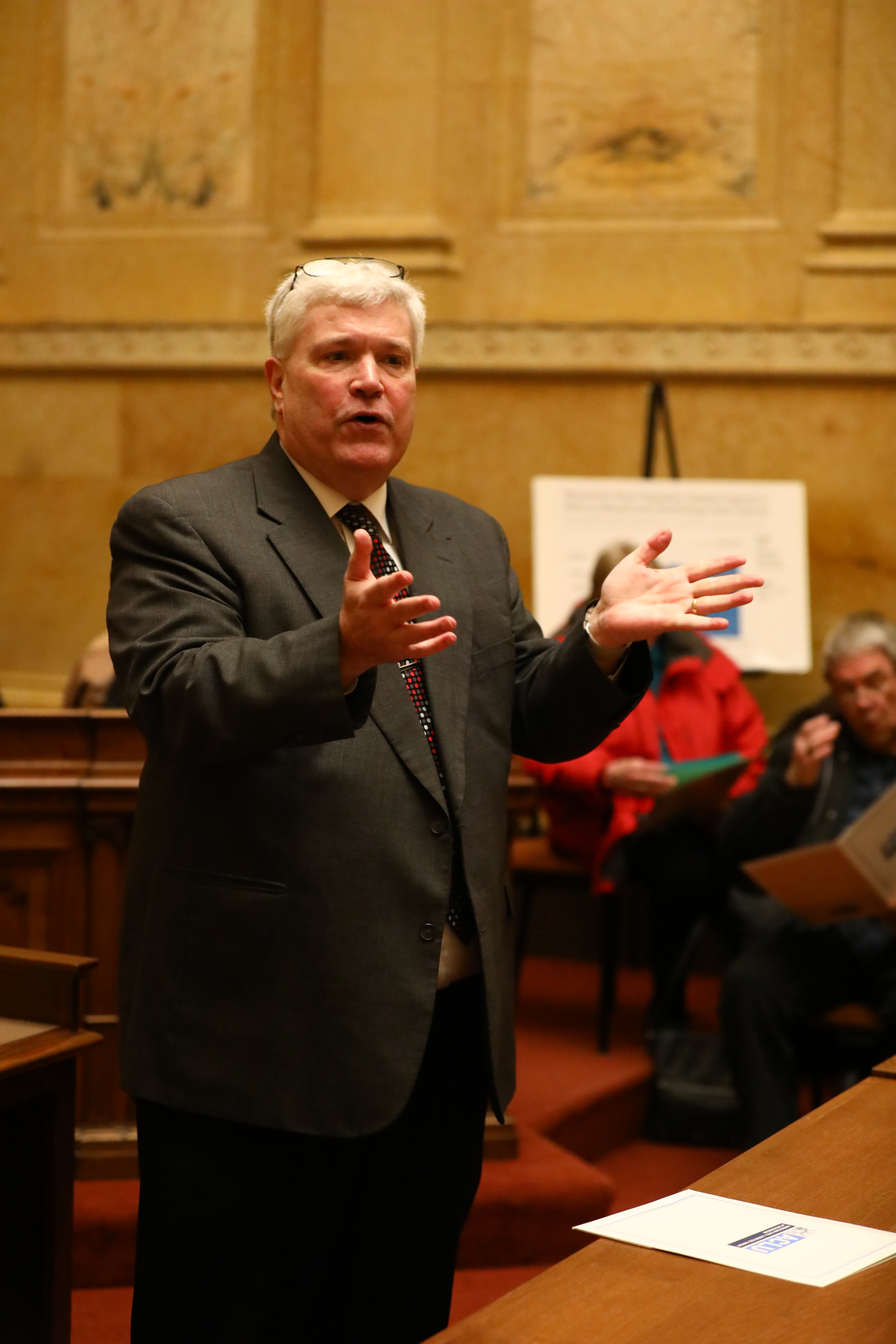 David Liners, Executive Director for WISDOM, a Wisconsin network of faith-based organizations, speaks to a group of citizens who gathered at the Capitol on March 13, 2018 to protest Senate Bill 54 (SB 54) which would require the Department of Corrections to recommend revoking a person’s extended supervision, parole, or probation if the person is charged with a crime while on extended supervision, parole, or probation. The bill would have also authorized the addition of $350 million in funding to increase prison bed space in the state. The group of about 100 citizens met for an information session about the bill and then lobbied senators to vote against the bill. The bill failed to pass after the Senate dropped it from their agenda on March 28, 2018.